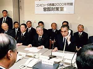 コンピュータが誤作動を起こす恐れのあるコンピュータ西暦2000年問題(Y2K)で、政府は31日から元旦にかけて小渕総理が陣頭指揮して警戒に当たった。総理官邸では、29日、危機管理センター内にコンピュータ西暦2000年問題官邸連絡室を設置、情報収集を開始。31日には同室の体制を強化して官邸対策室を設置、情報収集を一元化した。小渕総理は、31日午後8時30分、官邸対策室を視察するとともに、先に西暦2000年を迎えたニュージーランドの情勢を川島純・駐ニュージーランド大使に電話で聞いた。