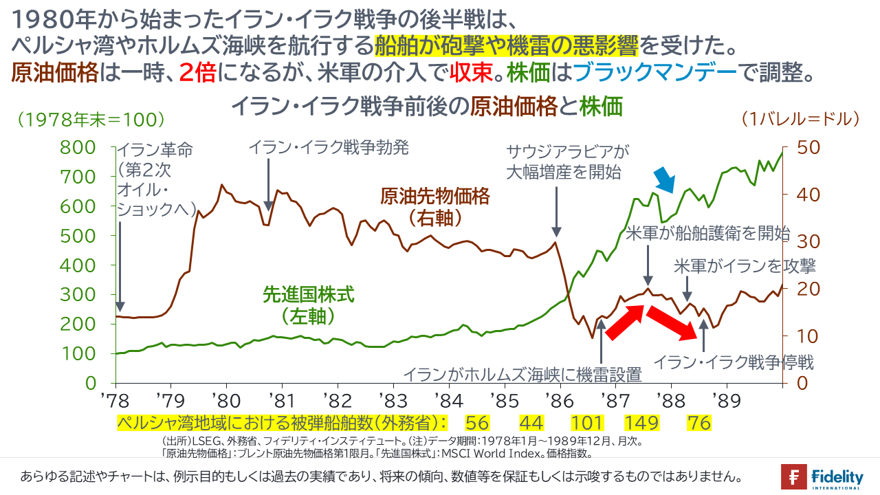 イラン・イラク戦争時の原油価格と先進国株式の株価の推移